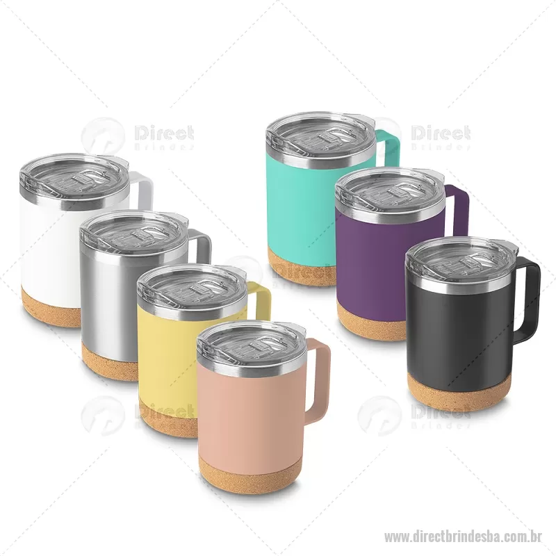 Caneca térmica em aço inox com parede dupla isolada à vácuo, tampa plástica e anel em silicone para vedação, alça lateral em inox na cor do produto, base em cortiça. Capacidade 350ml. - - DRTBACAN076