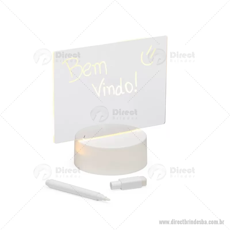 Luminária de Mesa Led Deixe qualquer espaço mais aconchegante e repleto de recadinhos incríveis com a nossa luminária. Com sua tela acrílica 3D, é possível soltar a criatividade e deixar mensagens inspiradoras, lembretes importantes ou até desenhos fofos, tudo de um jeito prático e super divertido! Com um funcionamento super simples, ela se conecta com cabo via USB integrado à base plástica ou por meio de 3 pilhas AAA (1.5V) não inclusas. Além disso, acompanha uma caneta plástica com apagador integrado, tornando a experiência ainda mais interativa e funcional. Essa luminária é perfeita para iluminar o ambiente e deixar recadinhos incríveis do seu jeito! Altura : 15,3 cm x Largura : 15 cm x Profundidade : 8,6 cm Tamanho total aproximado (CxL): Caneta: 11,2 cm x 1,2 cm Peso aproximado (g): 128 - - DRTBALL031